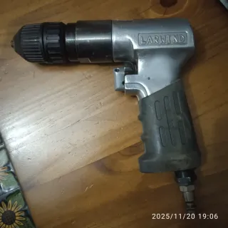 Herramienta de aire comprimido para trabajos de perforación. - Cuerpo metálico plateado. - Empuñadura gris. - Portabrocas negro.