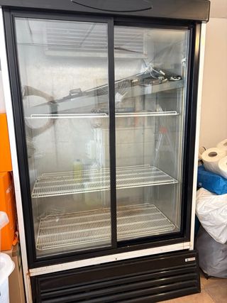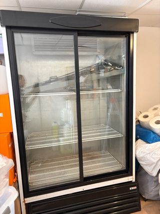 Armario refrigerado de gran capacidad, ideal para negocios. - Puertas correderas de cristal. - Estantes ajustables. - Diseño moderno en negro y blanco.