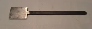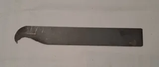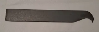 Herramienta manual de metal, fabricada artesanalmente. Su diseño curvo en un extremo permite acceder a zonas difíciles para retirar serrín o repasar cola.