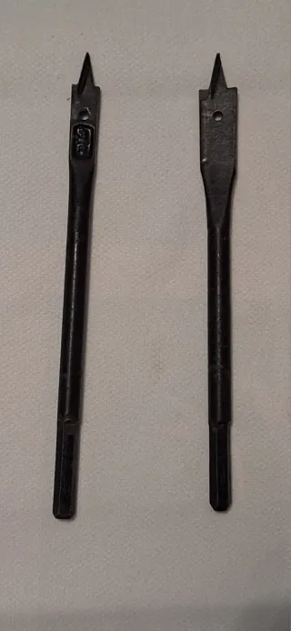 Se venden dos brocas de pala para madera. Son herramientas duraderas y eficientes para hacer agujeros. - Material: Metal - Color: Negro - Diseño: Punta afilada y vástago hexagonal