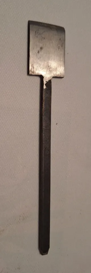 cuchilla de cepillo de carpintero antigua, específicamente diseñada para un cepillo de rebaje oblicuo. Esta herramienta se utiliza para tallar ranuras, medias ranuras o rebajes en marcos de puertas y ventanas. La forma inclinada (oblicua) de la hoja permite un corte gradual y más limpio en la madera.