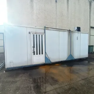 Caseta portátil de exterior. (Precio solo por caseta y cocina. No incluido mesas, bancos, frigo,...) - Estructura metálica para poder transportarla. - Puerta de acceso. - Paneles laterales blancos. - 3 ventanas - Encimera con fregadero y cocina portátil - Instalación de luz y de agua. Se ha estado utilizando como peña., y también es perfecta para merendero en cualquier finca. 7,2metros de largo * 2,5 metros ancho