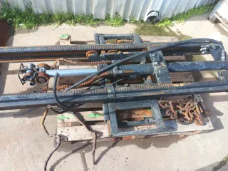 Mástil de carretilla elevadora de una etapa con desplazador - Mástil de 1 etapa. - Componentes de elevación y cadenas visibles. - Estructura metálica robusta.