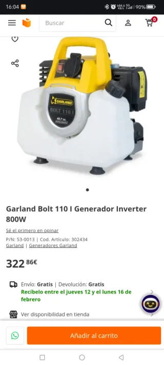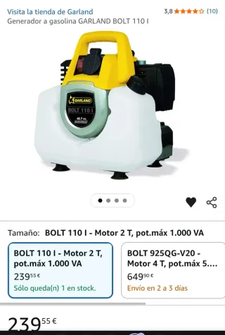 Generador inverter Garland Bolt 110i 1000W. Ideal para camper por su pequeño tamaño y peso, o casa de campo o el próximo apagón. Es inverter así que se puede conectar todo tipo de cargadores de móvil, pc, laptop, TV modernas, router...etc. Puede con frigorífico y arcón. Tiene 4 horas de uso del apagón de 2025. El depósito nunca se oxidará porque es de polietileno. Se vende en su caja, incluyo 1 bujía más bosch nueva de repuesto. Si vienes a buscarlo te llevas también una garrafa de 20 litros de mezcla casi llena. - Modelo: Bolt 110 I - Potencia máxima: 1000W - Potencia continua real: 800W - Cilindrada: 42.7 cc 2 tiempos. - Peso: