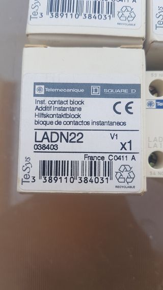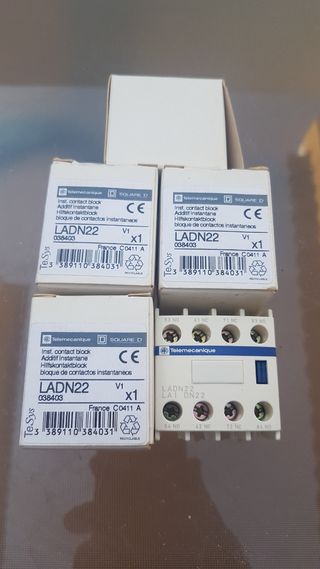 Se venden cuatro bloques de contactos auxiliares de la marca Telemecanique, modelo LADN22. Están en sus cajas originales sin estrenar - Modelo: LADN22 - Marca: Telemecanique - Cantidad: 4 unidades