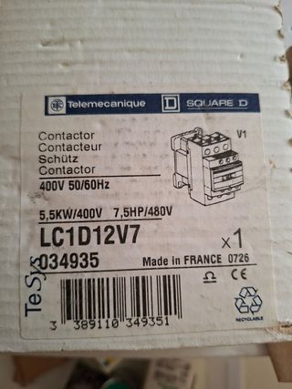Contactor Telemecanique LC1D12V7. - Modelo: LC1D12V7 - Voltaje: 400V 50/60Hz - Potencia: 5,5KW/400V 7,5HP/480V - Fabricado en Francia