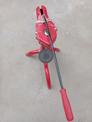 Bomba de trasiego antigua, - Estructura de hierro fundido. - Rueda grande con recubrimiento de cuerda. - Montada sobre ruedas para facilitar el transporte.