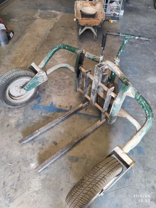 Transpaleta manual en buen estado, ideal para mover cargas pesadas. - Estructura de metal resistente. - Dos ruedas grandes y dos ruedas pequeñas para facilitar el movimiento. - Horquillas para la carga.