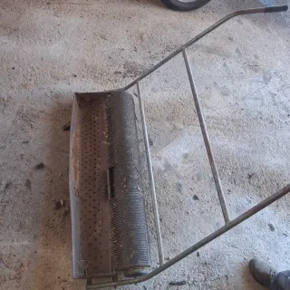 Herramienta para la recogida de aceitunas. Diseñada para facilitar la tarea en el campo. - Estructura metálica. - Ruedas para desplazamiento. - Cesta con perforaciones.