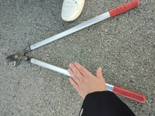 Tijeras de podar con mangos largos y empuñaduras rojas. - Mangos de aluminio. - Empuñaduras de goma roja. - Cuchillas de corte.