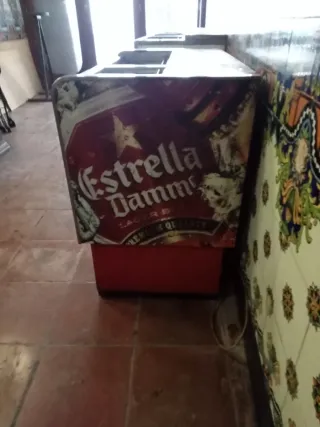 Botellero de la marca Estrella Damm, con diseño vintage. - Estructura metálica. - Parte frontal con logo de Estrella Damm. - Base roja.