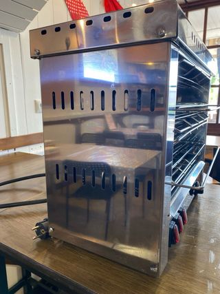 Tostador industrial de la marca HR FAINCA. - Diseño robusto en acero inoxidable. - Múltiples rejillas para tostar. - Controles frontales para ajuste.