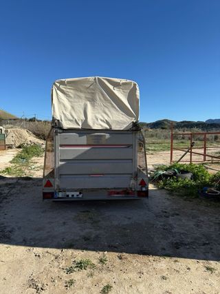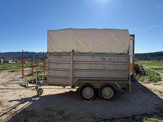 Remolque para caballos en buen estado, listo para su uso. - Matrícula roja. - Estructura metálica. - Cubierta de lona nueva. - Doble eje con ruedas. - Rueda jockey delantera.