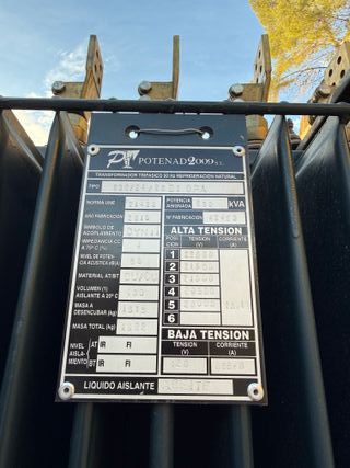 Transformador trifásico de 50 Hz con refrigeración natural. Tiene muy poco uso y funciona perfectamente. Toda la documentación necesaria y protocolo de pruebas. - Potencia asignada: 630 kVA. - Año de fabricación: 2015. - Material AT/BT: Cu/Cu. - Líquido aislante: Aceite. - Tensión primaria: 20 kV. - Tensión secundaria: 420 V.