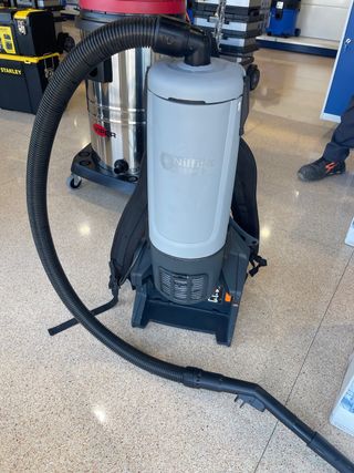 Aspirador Nilfisk GD 5 Battery con diseño de mochila. Se ha usado una vez. su precio original 1.800€ - Color gris claro y negro. - Manguera flexible negra. - Correas de mochila ajustables.