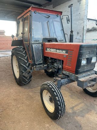 Tractor Fiat New Holland modelo 80-66S. - Color rojo. - Cabina. - Ruedas delanteras y traseras.
