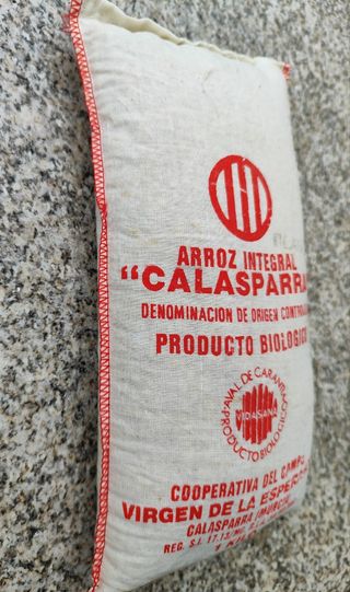 Bolsa antigua de tela con arroz integral Marca CALASPARRA Antiguo producto biologico