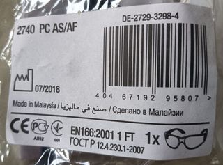 Gafas de seguridad 3M Comfort. Modelo 2740 - Modelo: PC AS/AF. - Referencia: DE-2729-3298-4. - Fabricadas en Malasia. - Cumplen norma EN166:2001 FT.