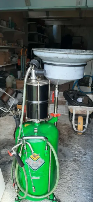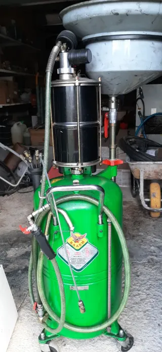 Equipo para la recogida de aceite usado. - Tanque de gran capacidad. - Embudo superior. - Mangueras de conexión.
