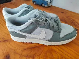 Zapatillas Nike Dunk Low en talla 42, combinando tonos grises y blancos. - Diseño bajo. - Detalles en cuero y textil. Precio nuevas 120€