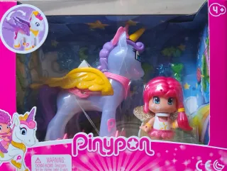 Set de juego Pinypon con un unicornio y una muñeca. - Unicornio con alas doradas y crin morada. - Muñeca con pelo rosa y vestido brillante. - Incluye accesorios. - Edad recomendada: 4+ años.