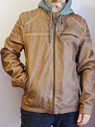 Cazadora estilo motero de polipiel en color marrón. Cuenta con capucha de tela gris integrada y cierre de cremallera. - Detalle de cremallera en bolsillo. - Diseño acolchado en hombros y mangas. - Puños y bajo elásticos.