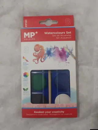 Set de acuarelas MP Colours con 8 colores vibrantes. Incluye un pincel. El empaque está un poco roto, pero el producto está en perfecto estado. - 8 colores intensos. - Pincel incluido. - No tóxico.