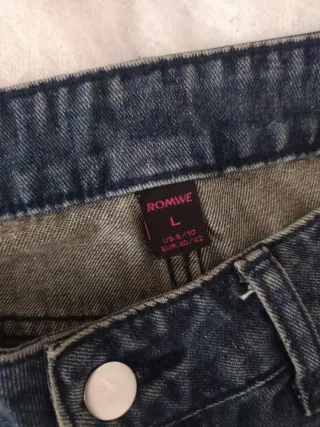 Pantalones vaqueros de estilo ancho con un diseño único de estrellas y detalles desgastados. Usado una sola vez. Se cortó la parte de abajo porque quedaba largo, pero apenas se nota al llevarlo puesto. - Estrellas decorativas aplicadas. - Aberturas rasgadas con forro. - Bajo deshilachado.