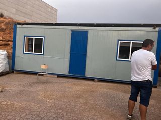 Se venden dos contenedores que pueden ser utilizados como viviendas o espacios de trabajo. Son estructuras modulares y versátiles. - Color gris con detalles en azul. - Ventanas con marcos blancos. - Puertas de acceso. - Tengo una diáfana de 6x2,5m La otra lleva una pequeña cocina y baño es de 7,5x2,5, se venden los 2 juntos y por separado, se acepta cambio por coche, se puede ver sin problemas, envío más fotos y vídeos.