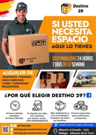 Hola, muy buenas. Se alquilan trasteros y mini almacenes. Acceso a tiempo completo. 24 Horas, 365 Días. Amplia zona de carga y descarga. ¡Nos adaptamos a tus necesidades! Trasteros de todos los tamaños. ¡Sin fianza, sin permanencia! En Alhaurín el Grande, Alhaurín de la Torre, Coín, Cártama, Pizarra, Álora, Málaga Centro, Polígono San Luís y Polígono Guadalhorce. Atendemos a correos, mensajes de WhatsApp y llamadas. 📞 697 923 926 Un cordial saludo, muchas gracias.