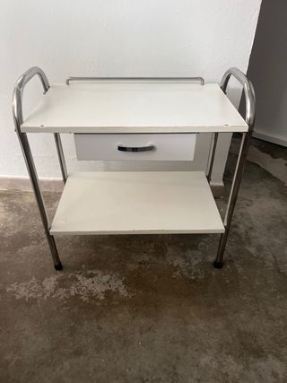 Mesa auxiliar de diseño moderno con un cajón y dos estantes. - Estructura de metal cromado. - Superficies blancas. - Cajón con tirador metálico.