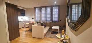// FLAT FOR RENT - MORE THAN 32 DAYS - AVAILABLE FROM 31 OF MARCH // Note: The contract is a so called temporary contract with a minimum stay of 32 days and can only be rented out for vacational purpose in order to obey the applicable legal frame. Please contact us for further info or clarification! Rent plus utilities (2.800 €/month) Optional parking available for 150 €/month. We are proud to present this spectacular, high-end flat located at Carrer Roger de Llúria 57 in the "8Sides Long-term Residence & Club" building, located in the emblematic district of Eixample Dreta, a stone throw away from Passeig de Gràcia shopping and business hub. 8Sides is without a doubt the best managed and most splendid serviced apartment complex in the city of Barcelona. Situated in an historic art deco building designed by the famous architect Josep Goday and erected in 1936, this property offers a unique urban co-living concept that merges the comfort and flexible services of a luxury hotel with the residential requirements of a private home. The average 65sqm² flat at 8Sides, features 2 bedrooms, 2 bathrooms (1 in-suite), and a cosy balcony/terrace/gallery (layout and decoration may slightly vary depending on floor -please see web-). This particular flat though, is one of the four 1 bedroom 2 bathroom flats we have. Instead of a second bedroom you double the are of the livingroom which is a perfect match for some of our clinets since it can be used as a office ore just be part of the livingroom space. This stunning apartment has been completely refurbished to the highest standards and as the rest of the building, designed and decorated by Pia Capdevila de Sas' famous Barcelona based interior design studio. The flat is fully furnished with top brand appliances and a kitchen by "Meine Küche". The bathroom flooring, tiling and fittings are by "Porcelanosa", and the air conditioning and heating are ducted, with aerothermal system. The flat also features double glazed alumini