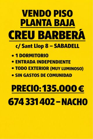 SABADELL Creu Barbera c/San Llop 8...vendo piso planta baja todo exterior, entrada independiete ,comedor cocina junto,1 dorm matrimonio y aseo con ducha. No alquilo,sólo venta. Precio 135.000€ 674 331 402 Nacho
