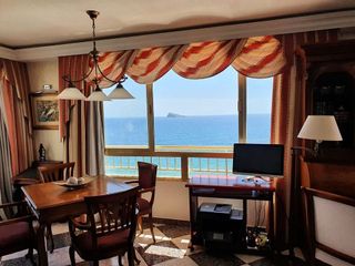 Espectacular Atico en Venta en Benidorm, en primera linea de mar, en el Paseo de Poniente con unas vistas impresionantes. Amplio salón-comedor de unos 60 m2 aproximadamente con techos dobles de escayola, iluminación indirecta, dos amplios ventanales con vistas directas sobre el mar y otro lateral con vistas al mar y al Paseo de Poniente y salida a la terraza anexa de unos 10 m2. El salón es totalmente diáfano sin columnas o pilares, lo que le da una amplitud y desahogo muy agradable sin pilares por en medio. El dormitorio principal sin contar la superficie del baño en suite es de 17 m2. El dormitorio de invitados tiene una superficie de 15 m2 aproximadamente y el tercer dormitorio una de 12´50 m2. La cocina-comedor de diario tiene una superficie de 22´50 m2, sin contar la superficie de la despensa que es contigua a la cocina. Desde la cocina y el comedor en la cocina también gozamos de impresionantes vistas al mar, En el pasillo de acceso a la vivienda hay una puerta metálica (cancela) que impide el acceso a la puerta de la vivienda. Encima del piso, en la terraza de la azotea existe una caseta privada de este piso para poner las botellas de butano y asi no tener que meter botellas de gas en la vivienda. El garaje tiene con la zona común de uso privativo y exclusivo una superficie aproximada de 50 m2. , escrituradas 2 plazas de garaje y autorización para el uso de la zona común en la escritura de declaración de obra nueva y división horizontal al igual que la caseta de la terraza y la cancela del pasillo. Hay 5 aparatos de aire acondicionado con bomba de calor para climatizar el piso. La carpinteria interior es de madera de cerezo y esta en perfectas condiciones. [IW].