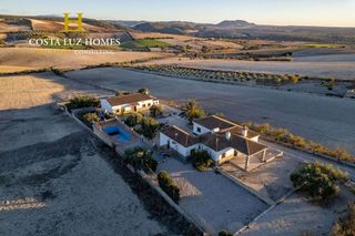 En el término municipal de Arcos de la Frontera, a tan solo 9 km del núcleo urbano y a 30 km de Jerez, encontramos esta espectacular finca rústica con 3 viviendas independientes y dos de ellas con licencia turística para explotar como Airbnb. Parcela de 21.000m2 situado en alto y con preciosas vistas con 3 construcciones principales, dos de ellas en escrituras, sumando un total de 285 m2 construidos y unos 211 m2 útiles aproximadamente. La casa principal consta de una gran cocina independiente, salón-comedor con chimenea y salida al porche con vistas a la piscina, 3 habitaciones con armarios empotrados y dos baños completos, uno de ellos en suite. La segunda vivienda, antigua nave con boxes, completamente reformada y convertida en vivienda con preciosos techos altos de vigas ofrece un enorme salón-comedor central también con chimenea, cocina independiente, dos habitaciones con armarios y un baño doble. Y la tercera vivienda es una pequeña casita de invitados frente a la piscina con un dormitorio y un baño. La casa principal y la casita de invitados tienen licencia turística. Además hay otras construcciones, como un sótano, una casita para la maquinaria de la piscina y el aseo exterior, un leñero, un horno de pan y dos garajes cerrados con capacidad para tres coches. Dispone de agua de Red y de pozo.