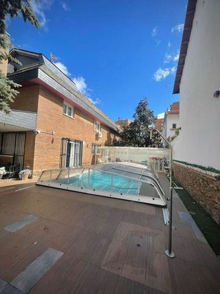 Esta Vivienda es Especial, ven a verla! . es un hogar! Se alquila magnifico Chalet, con piscina independiente, en perfecto estado. De 320 m2 construidos en parcela de 314 m2, con parcela jardín libres de 200 m2, Dispone de: 3 plantas más buhardilla. Además, con piscina independiente y jardín, garaje. Sol presente todo el día! Ven a verla es un hogar! La cocina está amueblada, 5 dormitorios muy amplios, 3 baños completos, 3 aseos. un amplio salón - comedor, independiente de 38 m2, buhardilla, terraza, y amplio sótano diáfano, un baño y acceso a puerta garaje. Buenas calidades. Aire acondicionado en toda la casa, calefacción individual por gas natural, alarma. Ganarás en calidad de vida! Bien comunicada autobuses Próximo al Centro Comercial "Plenilunio". Zona Rejas. Colonia Fin de Semana. Autobuses. Al lado del aeropuerto, Campo de las Naciones, parque del Capricho.