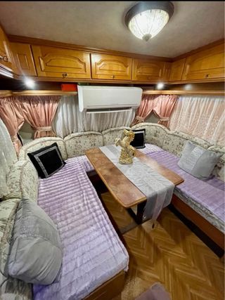 Caravana tres ambientes como nueva con documentación española en regla , baño sin wc solo ducha y lavabo; cocina con gas , nevera y fregadero ; cama con canapé de 150 cm ; luces led ; salón convertible en cama de 150 cm ; sofa enfrente de la cocina convertible en cama de 105 cm ; aire acondicionado ; termo eléctrico de agua caliente. Para cualquier duda preguntar.