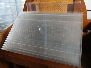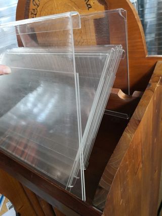 Expositores de metacrilato para anuncios de inmobiliaria. 10 unidades. Son los típicos carteles que se ponen en el escaparate para anunciar las viviendas. Hay 9 en perfecto estado y 1 con desperfectos. 20€/unidad. Medidas: 43x31x1cm