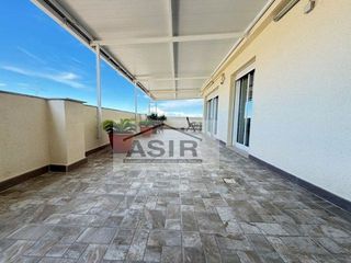 PRECIOSO E INCREÍBLE ÁTICO SEMINUEVO CON DOS GARAJES INCLUIDOOS EN EL PRECIO Y CON DOS GRANDES TERRAZAS CON 60 m2 y otra de 40 m2! SE VENDE COMPLETAMENTE AMUEBLADO Y CON ELECTRODOMÉSTICOS! Excelente ático chaflán completamente exterior, con dos grandes terrazas, una de 60 m2 y otra de 40 m2 con dos orientaciones, una de ellas a Levante y con dos plazas de garaje incluidas en el precio y en la misma finca. Vivienda en el centro de la ciudad, completamente nueva y completamente exterior que dispone de ascensor (actualmente se esta poniendo uno nuevo a estrenar) y cuenta con 3 amplios dormitorios (todos con aire acondicionado de split y todos con acceso a una terraza con 40 m2 y con posibilidad de cerrar esta terraza ya que tienes otra de 60 m2 y dar más amplitud a los dormitorios o hacer más dormitorios y baños si hacen falta), 1 baño completo. En el hall recibidor tenemos un gran armario empotrado. Aparte cuenta con una bonita cocina completamente amueblada, con espacio para comer, con zona de lavandería, con aire acondicionado de split y con acceso a una magnífica terraza de 60 m2 con techo de pandel de aluminio de sandwich de color blanco con unas bonitas vistas despejadas y orientación Levante. Aparte cuenta con un gran salón comedor con aire acondicionado de split y también con acceso a esa increíble terraza que cuenta también con un trastero. Se vende completamente amueblado y con electrodomésticos y en el precio se incluyen dos plazas de garaje en el mismo edificio.