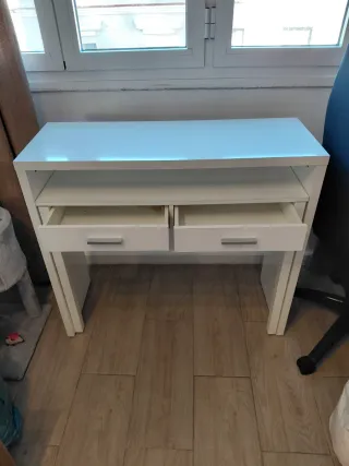Elegante escritorio blanco con un diseño moderno y funcional. Perfecto para tu espacio de trabajo o estudio. - Dos cajones con tiradores metálicos. - Superficie lisa y amplia. - Estructura robusta.
