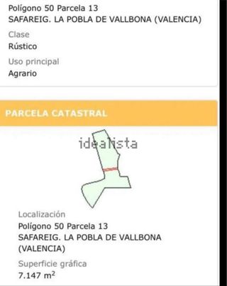 NO COBRAMOS COMISIÓN DE INTERMEDIACIÓN AL COMPRADOR Se trata de una parcela ubicada en La Pobla de Vallbona, provincia de Valencia, dispone de buenos accesos y está bien comunicada. Con los siguientes datos: - GALLIPONT Polígono 22 Parcela 114, situado en Sector R-28. Suelo urbanizable sectorizado sin ordenación pormenorizada. - Superficie de 11.309,60 m² - Ref. catastral: 46204A022001140000GZ. - Clasificación urbanística: Suelo urbanizable sectorizado sin ordenación pormenorizada. - Uso característico: Residencial Ciudad Jardín. Vivienda unifamiliar aislada. - Aprovechamiento tipo: 0,22 m²t/m²s. Número máximo de plantas: Dos (II) plantas + espacios bajo cubierta. La Pobla de Vallbona ofrece una amplia gama de servicios que incluyen centros educativos, sanitarios, deportivos y comerciales, lo que garantiza una alta calidad de vida a sus residentes. Entre sus ventajas destacan su entorno tranquilo y residencial, ideal para familias, así como la cercanía a áreas naturales y rutas para actividades al aire libre. Las comunicaciones terrestres son excelentes, con accesos directos a la autovía CV-35 y una eficiente red de transporte público, incluyendo autobuses y la línea de metro, que conectan rápidamente con Valencia y otros municipios cercanos. Por lo tanto la promoción a desarrollar disfrutará de un entorno tranquilo y natural, pero sin renunciar a todos los servicios, equipamientos y atractivos necesarios para una gran calidad de vida. Sus accesos, comunicaciones y transportes harán que tengas todo a tu alcance. No lo dudes, invertir en el suelo que te ofrecemos será una apuesta segura. Hipoges es una plataforma inmobiliaria donde podrás acceder a miles de activos inmobiliarios de diferentes tipos como viviendas, locales comerciales, terrenos, nueva obra... tanto a nivel particular como para inversores. Hipoges cuenta con una amplia cartera de activos inmuebles tanto en España como en Portugal y Grecia. Los activos de este propietario están sujetos a un p