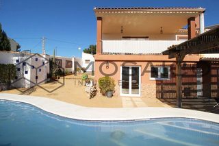 Bonito chalet con espectaculares vistas en suelo urbano en Montserrat con una parcela de unos 856m2 y una construcción principal de unos 340m2. Se encuentra en una urbanización con vecinos todo el año, con acceso asfaltado y alumbrado público. Esta propiedad, muy luminosa, se distribuye en tres plantas: En la planta baja, encontramos un garaje enorme con dos puertas de acceso de vehículos, una habitación con instalación para baño (actualmente se usa como trastero) y otra habitación preparada, en la actualidad, como despacho. En la primera planta, a la que accedemos a través de una fantástica terraza cubierta, encontramos un amplio salón/comedor con chimenea y ventilador de techo, así como puertas francesas. La planta también alberga una habitación, un baño completo y una cocina completamente equipada, muy amplia, con acceso a una segunda terraza cubierta trasera. En la segunda planta, encontramos un hall, tres habitaciones dobles y un baño completo. Una de las habitaciones dobles y el hall tienen salida a una amplia azotea con estupendas vistas. Todas las habitaciones cuentan con armarios empotrados y ventiladores de techo. Además, todas las estancias de la propiedad -incluidos pasillos y baños- cuentan con radiadores a gasoil. Las ventanas de la propiedad son de dobles (de climalit) y cuentan con mosquiteras. En el exterior, encontramos un precioso jardín consolidado y cuidado al detalle en el que destaca una preciosa piscina, de 8m por 5m, revestida en gresite y equipada con escaleras romanas y depuradora. También hay diversas zonas de terraza para disfrutar de los espacios al aire libre y una cocina exterior techada (paellero) muy cerca de la piscina, perfecta para organizar comidas sin tener que entrar a la vivienda principal. La propiedad dispone también de zonas para crear un huerto y cultivar frutas, verduras y hortalizas propias o crear nuevas zonas ajardinadas. Para aparcar, además del espacio en el garaje, el inmueble dispone de espacio par