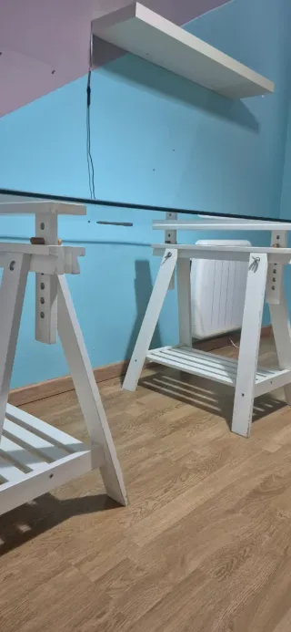Escritorio moderno con superficie de cristal y estructura blanca. - Diseño de caballete. - Estante inferior de listones.