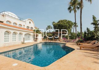 VILLA DE ÉPOCA EN ALQUILER EN VISTAHERMOSA Mar & Golf presenta esta espectacular villa de lujo en alquiler en una de las zonas de mayor prestigio y distinción de la ciudad de Alicante. Esta villa de época está dentro de una inmensa parcela ajardinada con frondosa y cuidada vegetación de todo tipo de 5156 m2 con una esplendorosa casa de 1290 m2. El precio del alquiler no incluye el mantenimiento del jardín y piscina por un valor de de 2.000 euros al mes. A la vivienda se accede desde una imponente puerta de arco, de madera que nos lleva a un deslumbrante hall con suelos de mármol iluminado por dos enormes vidrieras en sus extremos y coronado por una escalera también de mármol en forma de rama que conduce a las dos alas de la planta superior. En la planta baja a continuación del hall principal encontramos una enorme cocina de diseño totalmente equipada y un amplio espacio para uso como comedor informal. La cocina está totalmente acristalada por lo que se puede disfrutar de las vistas del jardín y la piscina. A continuación encontramos el gran comedor principal y finalizamos con un enorme salón de estar con techos de vigas de madera y chimenea totalmente acristalado. Volviendo sobre nuestros pasos hacia el hall de entrada encontraremos 3 espectaculares habitaciones con baño en suite y vestidor cada una de ellas y con acabados de lujo en cada detalle. En la planta superior encontraremos las dos esplendorosas habitaciones principales con enormes baños en suite y lujosos vestidores, ambas con terraza individual desde donde se puede disfrutar de las preciosas vistas del jardín y toda la zona de Playa San Juan Condomina con las montañas alicantinas de fondo. En la planta semisótano encontramos 4 baños adicionales, bodega, sala de cine, sauna con jacuzzi y zona relax, gimnasio y zona gamer. La parcela dispone de una preciosa piscina con solarium, dos barcoas, una de ellas con merendero bajo las copas de los árboles, garaje cubierto para cinco vehículos y dos entradas