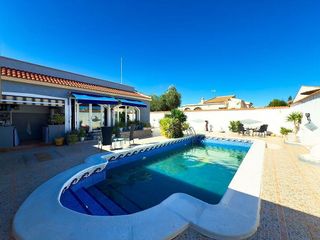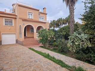 Villa independiente con jardín espacioso, terrazas, piscina y garajes en gran parcela. Se compone de 2 viviendas con la vivienda principal en planta baja y la otra vivienda en planta semisótano. La vivienda principal dispone de un gran salón comedor con chimenea y terraza enorme, una cocina independiente totalmente equipada con acceso al jardín, 3 dormitorios dobles con armarios empotrados y dos cuartos de baño (uno en-suite con dormitorio principal). Amueblada. Aire acondicionado. Calefacción. La otra vivienda en planta semisótano, adosada a la vivienda principal, dispone de un salón comedor, una pequeña cocina, 2 dormitorios dobles con armarios empotrados y un cuarto de baño. Amueblada. Ideal como estancia para huéspedes! Todo ello ubicado en parcela de unos 900 m2 con jardines, terrazas, arbolado, barbacoa, piscina, 2 garajes cerrados (uno con cuarto de baño completo) y trastero en entorno tranquilo. Cerca de todos los servicios, restaurantes, supermercado, farmacia y unos 3 km de las playas. Y a 1 km, tiene el acceso a la autovía AP7 que conecta con los aeropuertos de Alicante y Murcia.