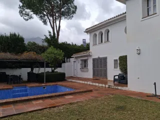 ⛳ Elegante Villa Mediterránea junto al Golf en Marbella con Seguridad 24h Elegante villa de estilo mediterráneo ubicada junto al campo de golf, a pocos minutos de las playas de Bahía de Marbella y del vibrante centro de la ciudad. Una propiedad excepcional que destaca por su amplitud y su ubicación privilegiada, ideal para quienes buscan tranquilidad cerca del mar y el golf. La espaciosa casa se distribuye en dos niveles sobre una parcela de más de 1.000 m², contando con cuatro dormitorios, incluido uno convenientemente ubicado en la planta baja, y cuatro baños. El interior ofrece un luminoso salón con una acogedora chimenea y una cocina independiente de tamaño generoso, mientras que el exterior dispone de hermosos jardines y una piscina privada perfecta para vivir al aire libre. La propiedad también está disponible para alquiler por un periodo de 11 meses, entregándose sin muebles, aunque existe la opción de alquilarla amueblada por un coste adicional de 10.000 €. Situada dentro de un exclusivo complejo residencial, la villa cuenta con seguridad las 24 horas y acceso a piscinas comunitarias, garantizando un entorno seguro y relajado. Su emplazamiento permite disfrutar de la cercanía a las mejores playas de Marbella y a todos los servicios esenciales del centro urbano, combinando comodidad y un estilo de vida distinguido. Contáctenos hoy mismo para obtener más información o concertar una visita privada a esta magnífica villa.