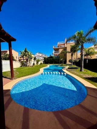Apartamento en planta baja con terraza y acceso directo a jardines y piscina, cerca del centro de Dénia y de la playa. Te presentamos esta acogedora vivienda situada en una de los residanciales más bonitos de Dénia. Se trata de un apartamento situado en la planta baja que destaca por su terraza de 30m2. Cuenta con un comedor con cocina americana y un solarium acristalado que da acceso a la terraza. La vivienda tiene dos habitaciones y un cuarto de baño con ducha. La propiedad incluye una plaza de parking, algo muy valorado en la zona. Además, está ubicada a pocos minutos del centro de Dénia, con todos los servicios a mano: supermercados, transporte, colegios, centros médicos y una amplia oferta de ocio y restauración. Y lo mejor de todo: la playa se encuentra a solo un paseo. Es una opción perfecta residencia habitual o segunda residencia. Una oportunidad para vivir cerca del mar con todas las comodidades al alcance. Ven a vistarla, te esperamos.