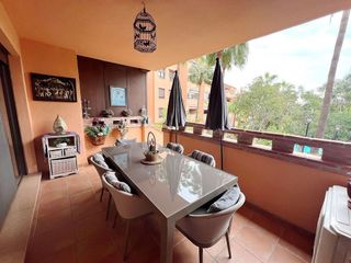 Maravilloso piso en la urbanización de park suite Incosol Río Real (Costa del Sol). Se trata de un amplísimo apartamento de 100 m², muy luminoso durante todo el día. El piso cuenta con una cocina funcional, un salón muy grande con espacio adicional ideal para utilizar como oficina o zona de trabajo, y una preciosa terraza acondicionada con varios ambientes: un salón exterior, un comedor y una zona para hamacas, perfecta para relajarse. En el otro extremo de la vivienda se encuentra un gran dormitorio equipado con dos camas de matrimonio y un amplio espacio para almacenamiento de ropa y de cualquier cosa mas. Desde el dormitorio se accede a un baño en suite, de gran tamaño y equipado con bañera. La vivienda ofrece una sensación de paz y tranquilidad, ideal para quienes buscan comodidad y amplitud. Además, dispone de parking cubierto y cerrado, tiene seguridad. No cuenta con piscina de momento.