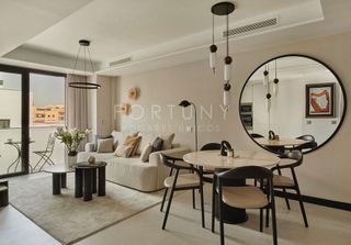ELEGANTE Y MODERNO PISO DE DOS DORMITORIOS CON TERRAZA Y PARKING EN EL CENTRO DE MARBELLA Fortuny Hogares Únicos presenta este elegante y moderno piso de dos dormitorios con terraza y parking en el centro de Marbella. Ubicación La vivienda se sitúa en una de las zonas más céntricas y demandadas de Marbella, en pleno entorno urbano consolidado y a escasos minutos del Paseo Marítimo y de la playa. El área ofrece una excelente calidad de vida gracias a su amplia oferta de servicios: supermercados, boutiques, farmacias, centros médicos, gimnasios y una variada oferta gastronómica con restaurantes de prestigio y cafés con encanto. Además, cuenta con paradas de transporte público cercanas y una excelente conexión con las principales vías de acceso, lo que permite desplazarse cómodamente tanto por Marbella como hacia otras zonas de la Costa del Sol. Distribución La vivienda está orientada al este, cuenta con una superficie total construida de 100 m2 y se distribuye en un hall de entrada que da paso a un amplio y luminoso salón-comedor de estilo moderno y atemporal, con salida directa a una agradable terraza de 4m2 con vistas urbanas. La cocina independiente está totalmente amueblada y equipada con electrodomésticos. Un pasillo distribuidor conduce a la zona de descanso, compuesta por dos dormitorios con armarios empotrados. El dormitorio principal dispone de un cuarto de baño en suite, mientras que un segundo cuarto de baño completo da servicio al resto de la vivienda. Calidades El inmueble fue construido en el año 2019 y presenta excelentes calidades. Destacamos los suelos de gres porcelánico, climatización mediante aire acondicionado por conductos, puertas de paso lacadas en blanco, ventanas de doble acristalamiento que garantizan un buen aislamiento térmico y acústico, y una cocina equipada con electrodomésticos. Zonas comunes El edificio cuenta con ascensor, lo que aporta comodidad y accesibilidad. Una plaza de aparcamiento incluida en el precio. Normativa