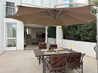 Terrazas de la Quinta, Benahavis Apartamento recientemente renovado en la ubicación privilegiada de La Quinta Bienvenido a este exquisito apartamento en planta baja escondido en la codiciada comunidad de La Quinta. Esta residencia de tres habitaciones, bellamente diseñada y recientemente renovada, ofrece una combinación armoniosa de simplicidad moderna y estética escandinava, brindando un entorno de vida sereno y tranquilo. Al ingresar, será recibido por un diseño espacioso con abundante luz natural, complementado con calefacción por suelo radiante y aire acondicionado centralizado para una comodidad durante todo el año. La sala de estar de planta abierta fluye a la perfección hacia una elegante cocina, equipada con electrodomésticos Siemens, que ofrece funcionalidad y elegancia. La suite principal es un refugio tranquilo, completo con armarios empotrados y acceso a la pintoresca terraza privada. Aquí, encontrará un comedor y un salón al aire libre, así como un espacio de parrilla y cocina, perfecto para cenar al aire libre mientras disfruta de las vistas en primera línea del campo de golf y los cielos azules y soleados típicos de Marbella. El toldo retráctil electrónico le permite disfrutar de la terraza en cualquier clima, mientras que las persianas de seguridad y un sistema de alarma brindan tranquilidad. Los dos dormitorios restantes, cada uno equipado con camas dobles, están igualmente bien equipados y ofrecen fácil acceso al baño moderno que comparten. Salga y más allá de la terraza para descubrir un jardín privado que ofrece acceso directo a la piscina comunitaria, proporcionando un entorno idílico para relajarse. El entorno tranquilo es particularmente notable, ya que el apartamento está ubicado lejos de las carreteras principales o epicentros altamente urbanizados, mientras que su proximidad al campo de golf crea un santuario donde puede relajarse después de un día de actividad. Esta propiedad viene completamente amueblada, por lo que está lista para m
